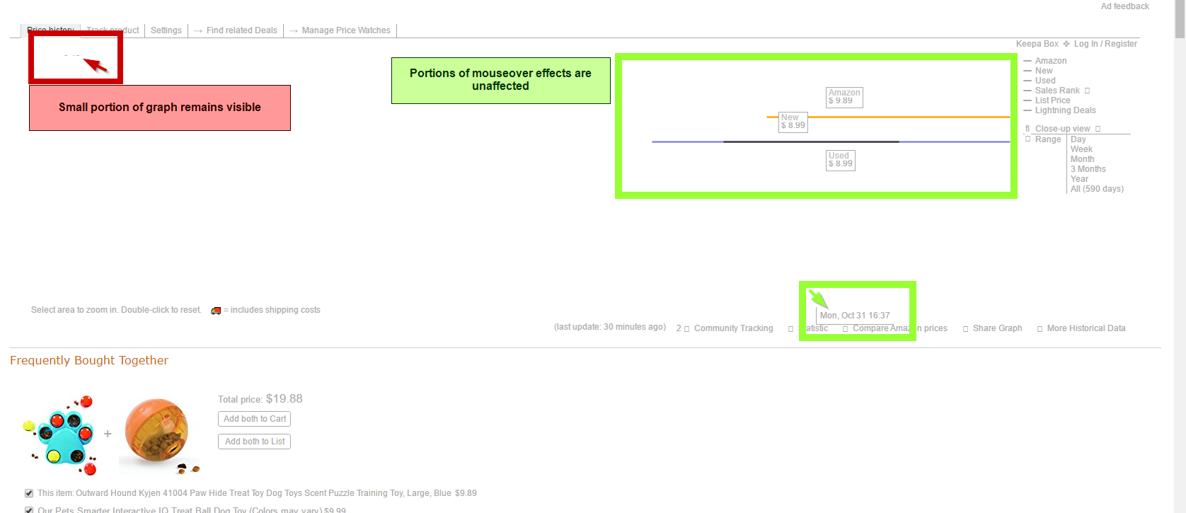 Thank you for making this extension. I'm seeing an issue with inline frames not displaying correctly-specifically with another extension (Keepa) displaying graphs embedded onto a webpage (amazon). When the DP extension is activated portions of the graph becomes blank while other portions (text and mouseover events) display correctly. I've attached screenshots that show the specific issue as it appears on my screen. I've tried whitelisting the domain from which the iframe originates (keepa.com) but this doesn't affect the issue. Thanks for any help!