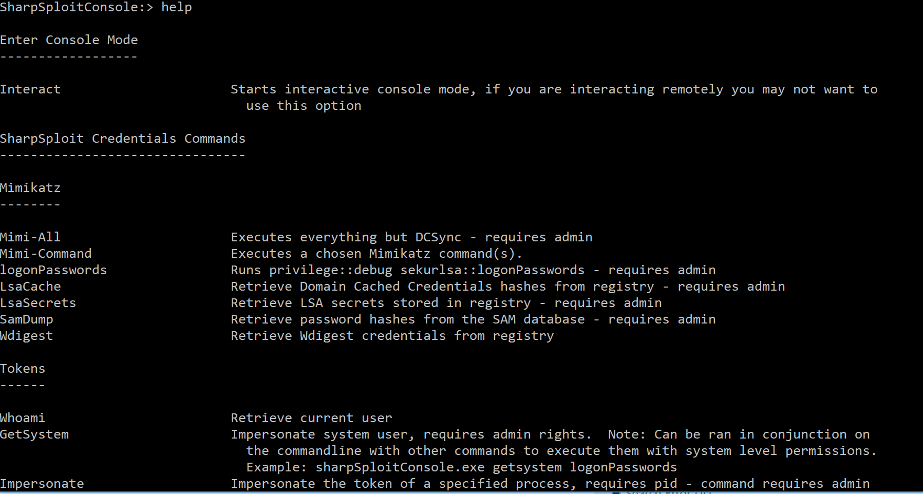 By default all commands can be taken in as command line args, they will be executed and the program will exit (great for remote shells). This looks something like the following: sharpSploitConsole.exe getSystem logonPasswords. Alternatively, if you want to use the interactive console mode, you can use the interact command to get a pseudo-interactive shell.