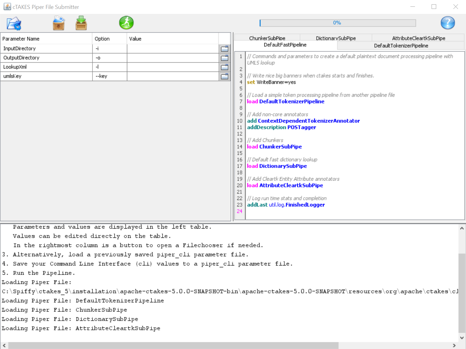 Piper Files contain cTAKES pipelines in a simple flat file format. They can be run via command line using the bin/runPiperFile script. If you are running from a development environment (checked out trunk from SVN) they can also be run using the Piper File Submitter GUI. The GUI allows the user to enter and save command line parameters, making any future re-run of a piper file quick and easy.