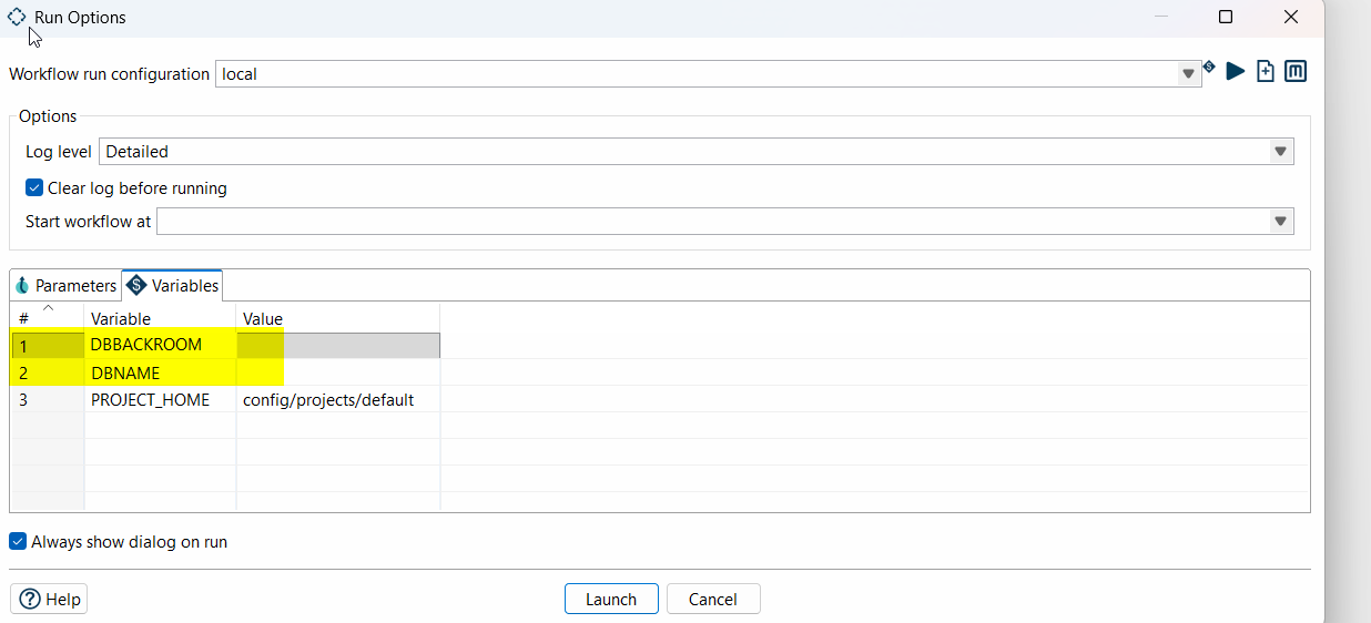 When I run a workflow, I can set the variables DBNAME and DBBACKROOM.