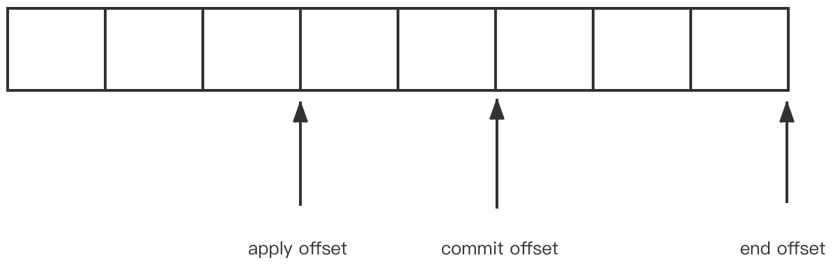 As shown in the figure below, the metadata log has three important offsets. The end offset is the offset of the last log entry, the commit offset is the maximum offset of log entry that has been confirmed to be replicated to major nodes, and the apply offset is the maximum offset of log entry that has been built into the metadata state. The three offsets must satisfy apply offset <= commit offset <= end offset.