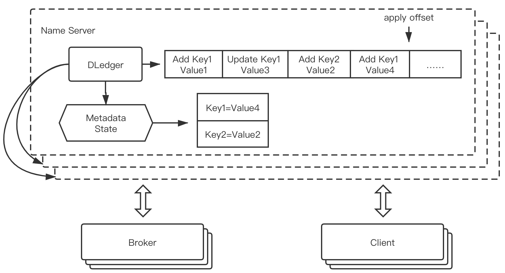 DLedger has guaranteed the consistency of log replication. In addition to log replication, each nameserver needs to consume logs in order to build the system state of metadata.