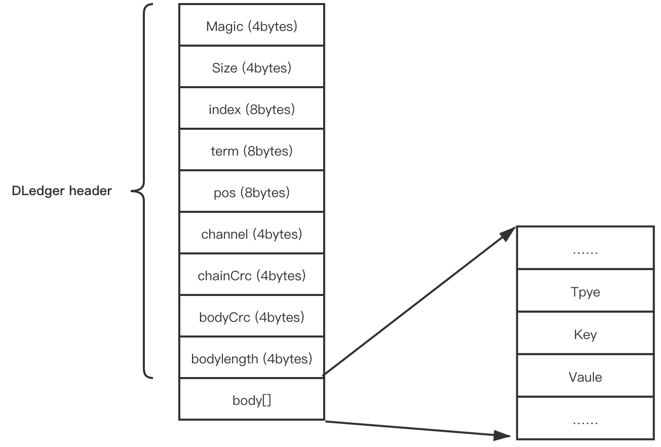 As shown in the figure above, metadata operations will be recorded in the DLedger log. This proposal does not specify the log format, but it contains at least the following fields: