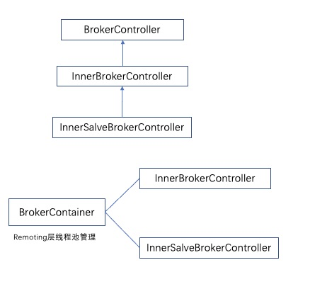 }The BrokerContainer will manage multiple innerBrokerControllers and innerSlaveBrokercontrollers. InnerBrokerController inherits from the brokerController and has the ability to reuse the brokerController. InnerSlaveBrokerController inherits from the innerBrokerController and has the ability to reuse the innerBrokerController, InnerBrokerController and innerSlaveBrokerController in the same BrokerContainer share the transport layer.
