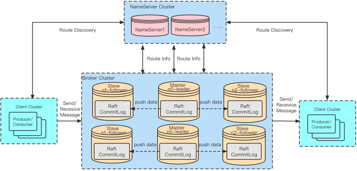 Second, there are two mechanisms to sense when a group of brokers is on or off in a timely manner. First is when the nameserver detects a change in the smallest broker id in the group described above, it reversely notifies all brokers in the group. Secondly, RIP-32 adds a GetBrokerMemberGroup request to the nameserver to get the broker replica group.