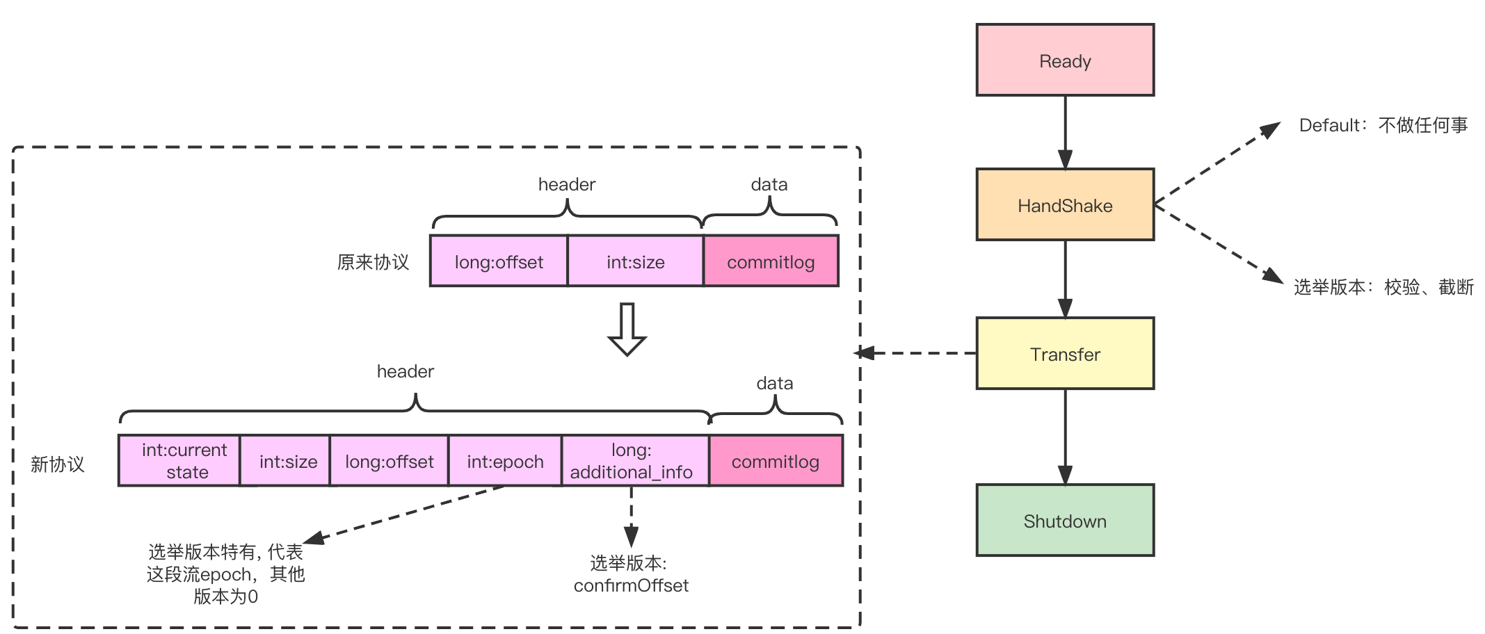 Replication: Broker's internal replication adds epoch and start offset, epoch represents the version, and start offset is the start physical offset from the version number. Data truncation after switching is completed with both epoch and start offset to ensure commitlog consistency.