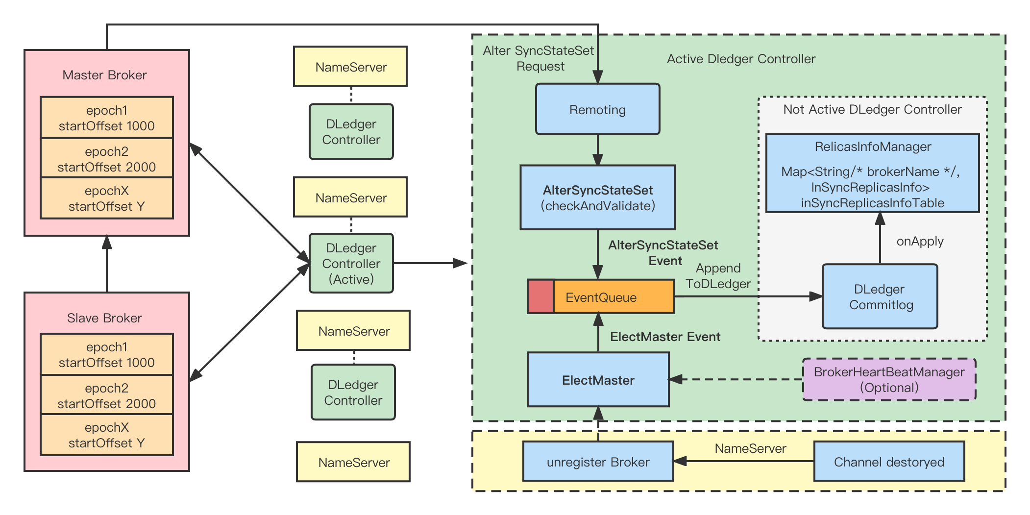 Alter SyncStateSet: The master broker will regularly detect whether the SyncStateSet needs to be expanded or reduced, and report the SyncStateSet information through the API. The DLedger Controller will maintain the SyncStateSet of the broker replica group with strong consistency.