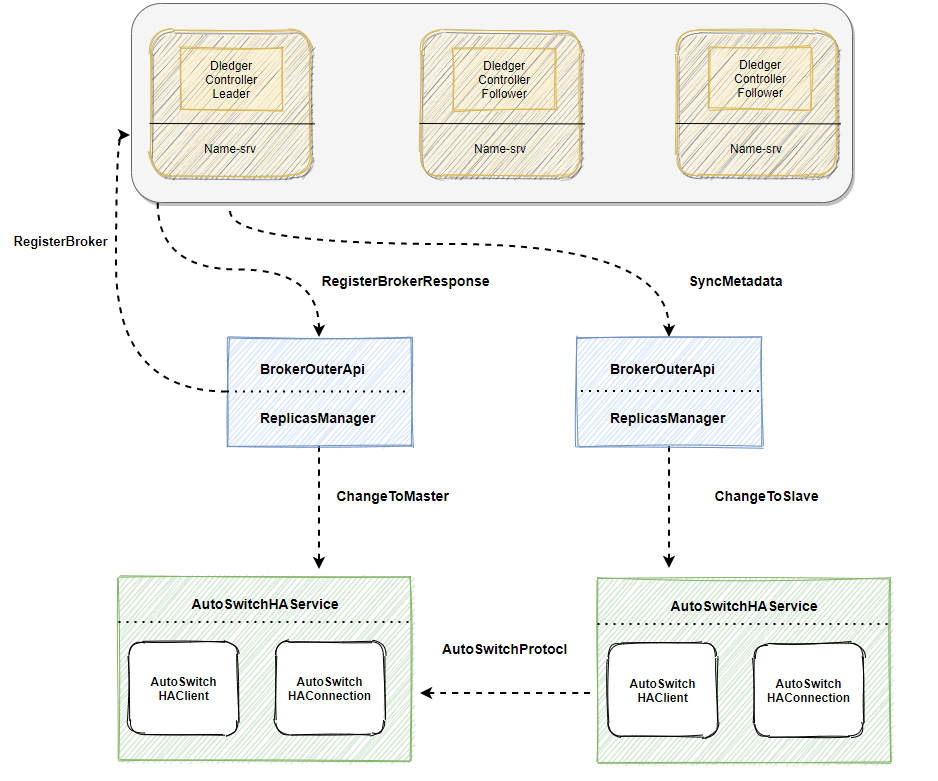 Elect Master: Once the Master of the Broker's replica group is offline, the Active DLedger Controller is notified via heartbeat mechanisms (there are two of them, NameServer's lightweight heartbeat if embedded, or its own heartbeat module if deployed independently), Then calling the Elect Master API will re-select a master from the SyncStateSet, and send instructions to the Broker to complete the master-slave switch.