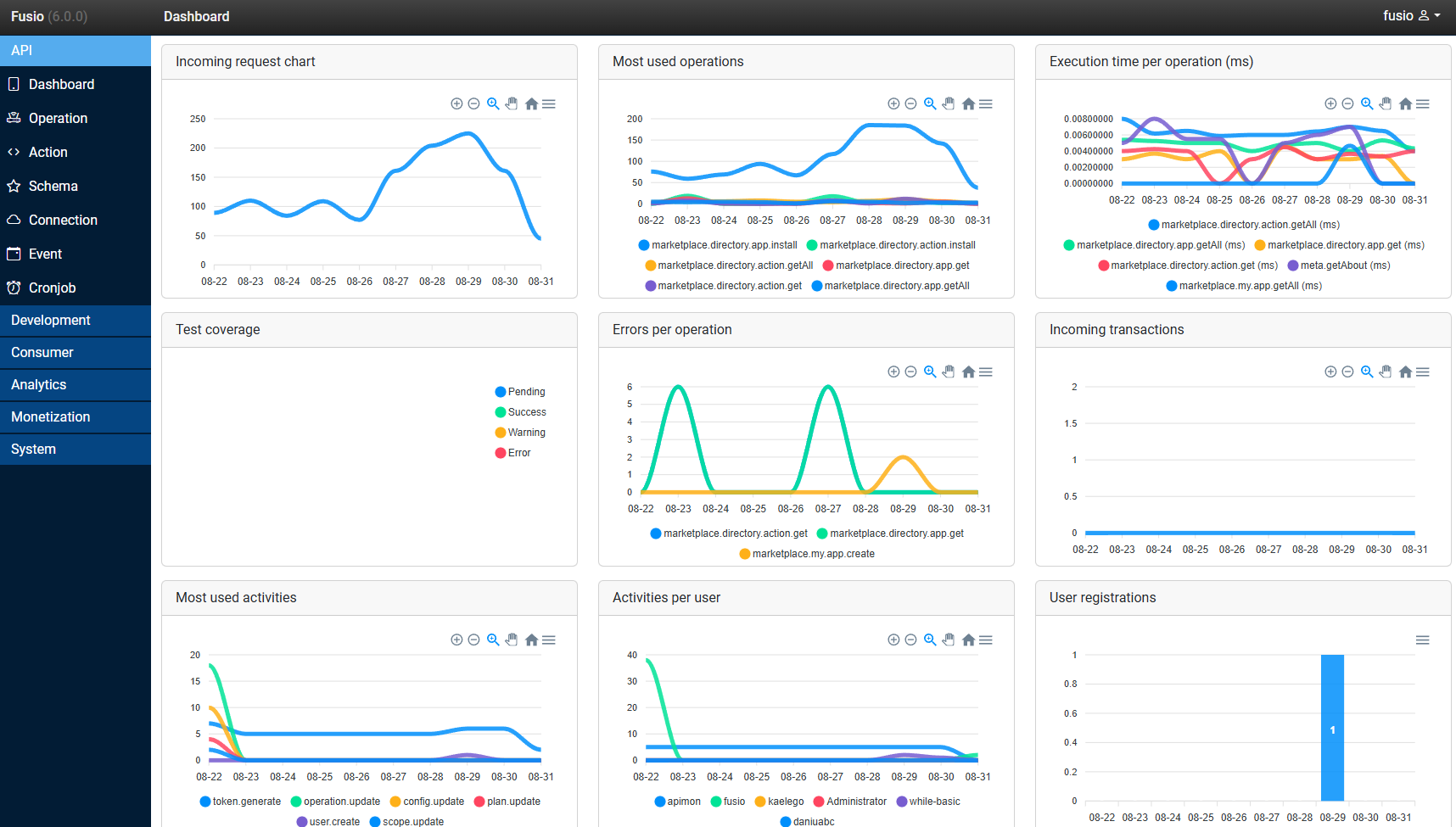 Simple API monitoring service which helps to monitor your Fusio installation. It is optimized for Fusio, but it can be also used for different API endpoints. APImon invokes your endpoints in specific intervals and notifies you about changes. It also includes an uptime page for your users for example s. https://api.apimon.app/status/fusio_marketplace