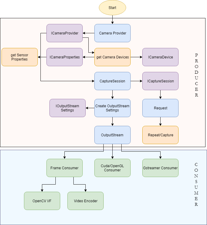 This function represents the Producer side of our system. The Libargus camera pipeline is set up here (identical to the block diagram in the above image) and the CUDA consumer is initialized with the output EGL streams. This function contains a lot of dense code that would be difficult to document in comments. As such we provide an extensive line-by-line description here.