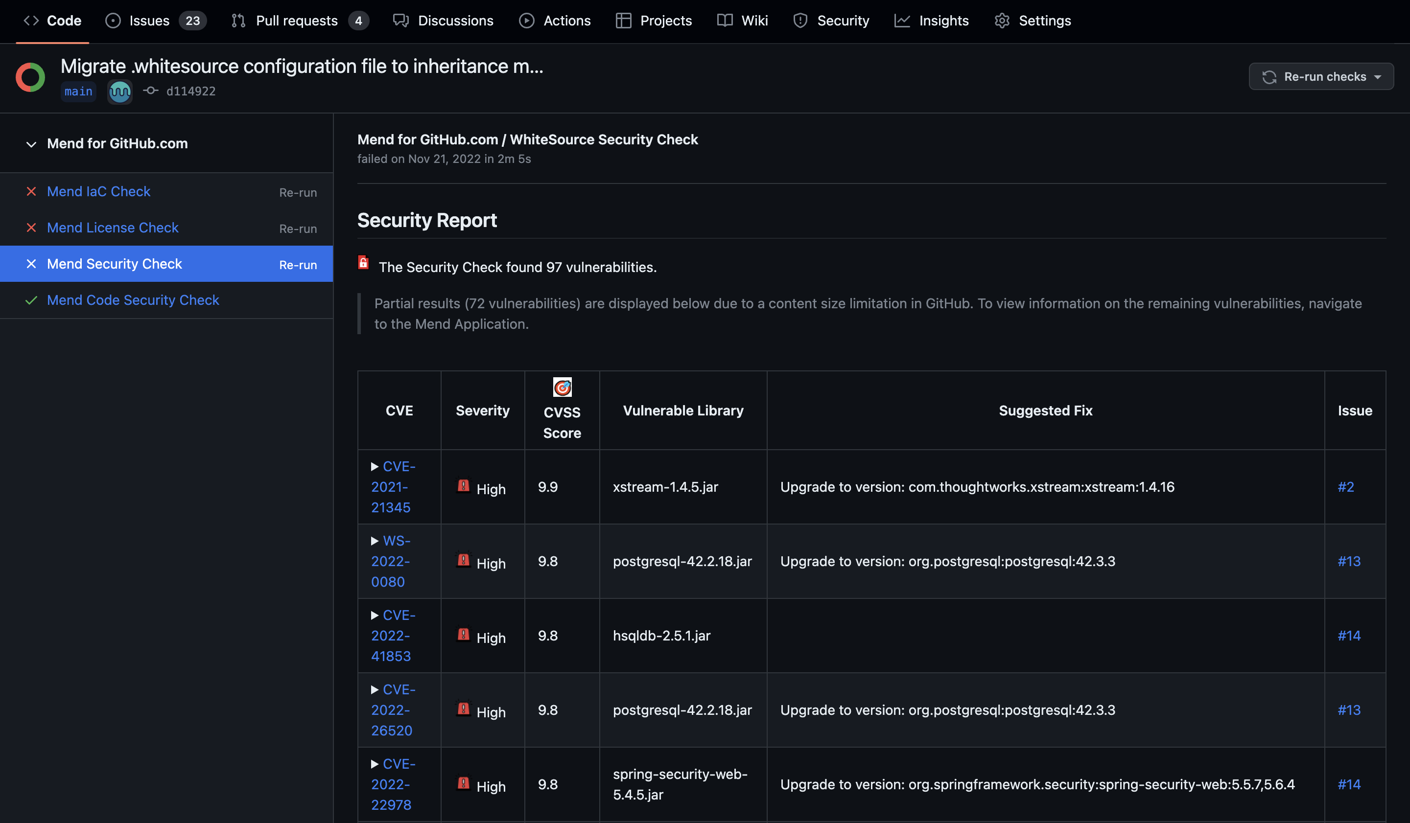 Mend for GitHub.com scans create Mend Security Check and Mend Code Security Check Reports that offer insight into new, resolved, and overall security findings to help you identify and address problems without ever needing to leave GitHub.com.