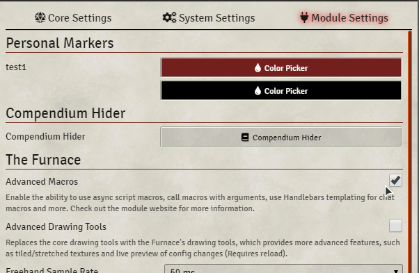If you want to inform your users that they can use the color picker but your module also works without the library, you can use the colorSettingStub.js file. This will show a popup if the library is detected but not enabled. Or a notification if the library is not detected at all. Both the popup and notification can be disabled by the user via a button or the settings.