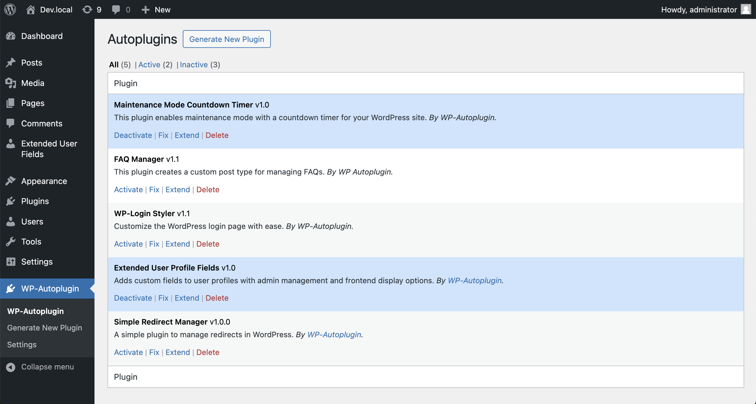 - While WP-Autoplugin provides a convenient listing screen for generated plugins, they can also be managed from the standard WordPress Plugins screen.