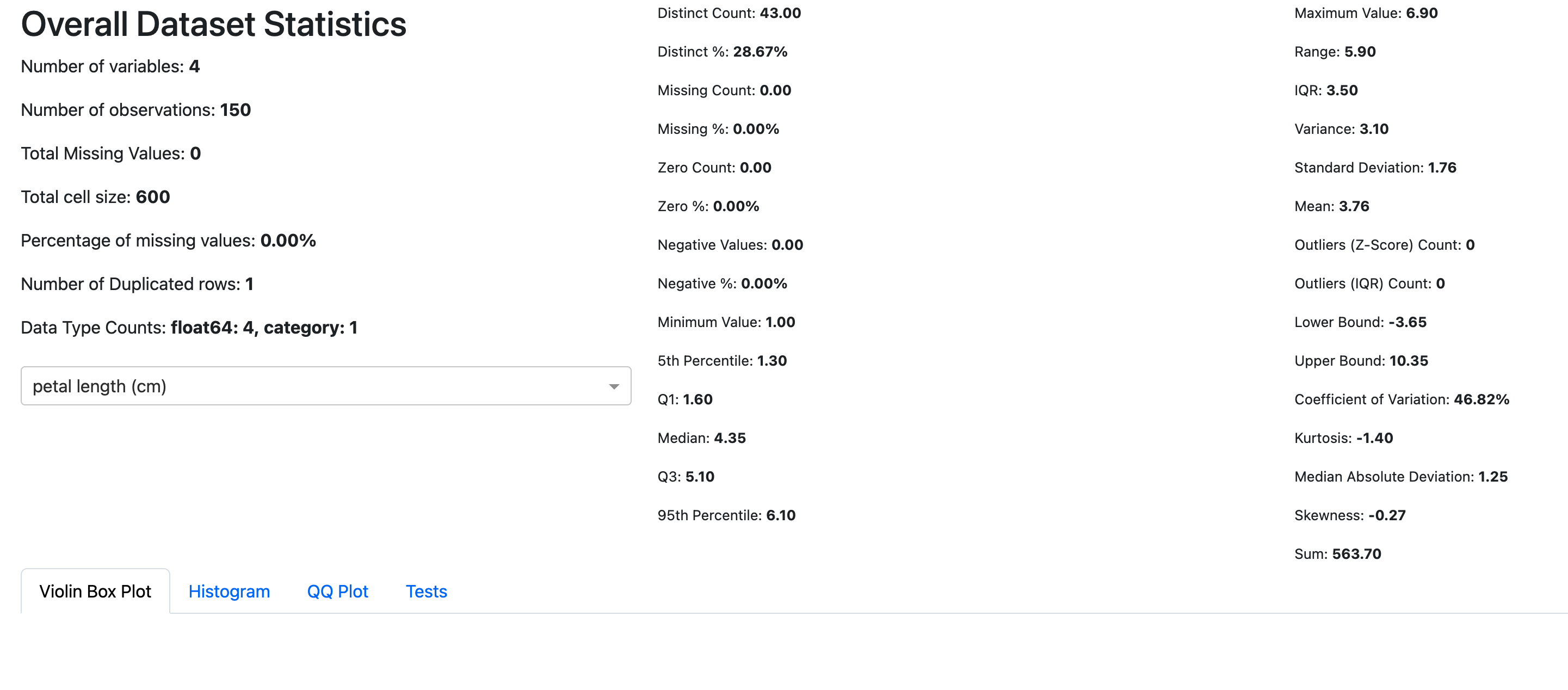 app = numerical(data) # Generates a dashboard displaying summary statistics for numerical columns in the dataset.