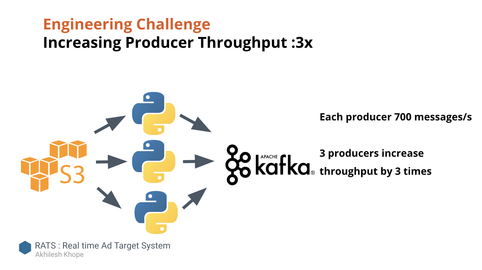 OR body LIKE '%long week%'")Increasing producer throughput Each producer sends data to kafka at the rate of 700 messages/s (acks = 1, as I dont want to loose any messages). To increase the throughput (messages/s) I increased the the number of producers parallely writing to multiple kafka partitions.