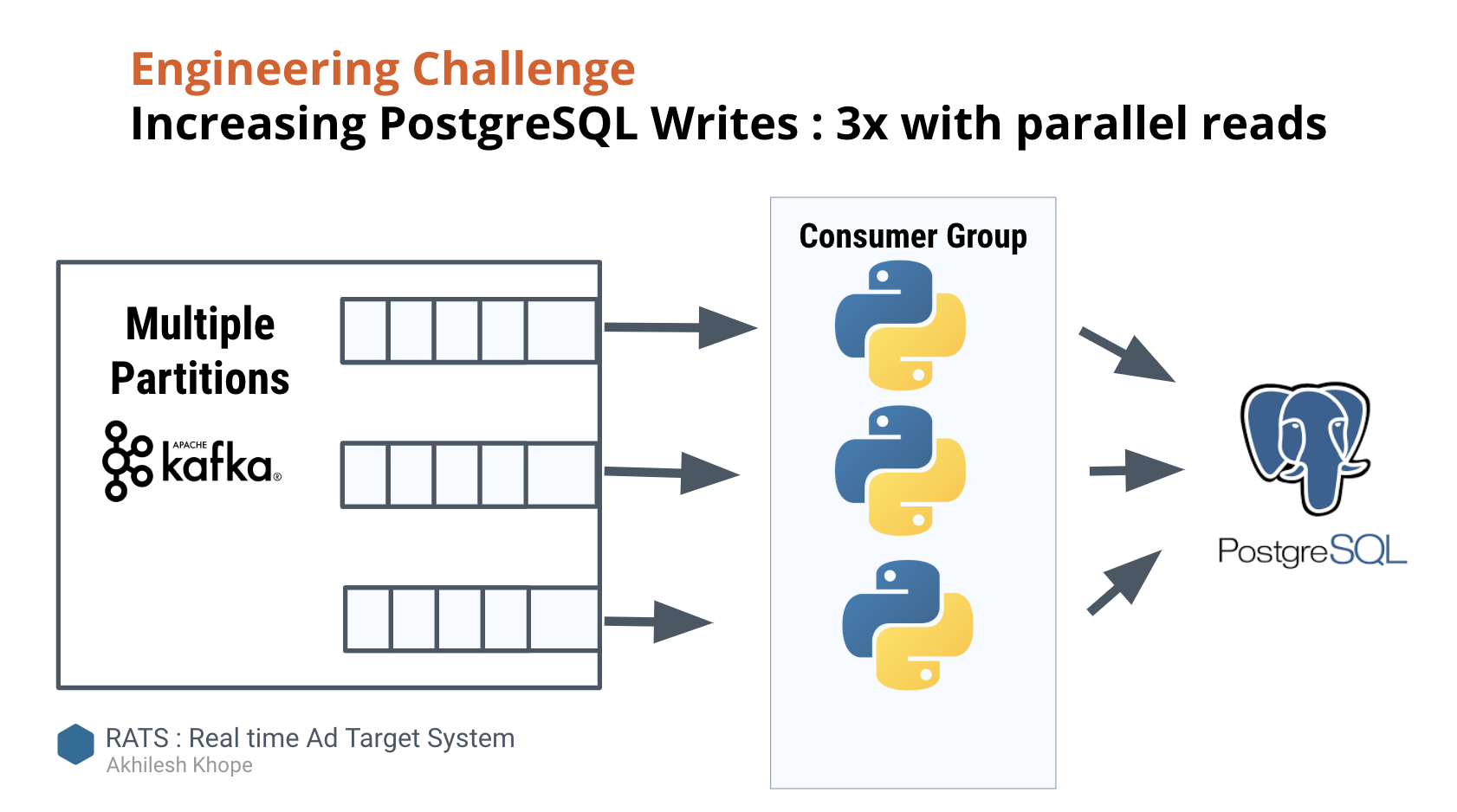 Increasing consumer throughput Each consumer can write to postgres at a rate of ~1000 messages/s. To increase the write speed I used multiple kafka partitions and multiple consumers in a consumer group.