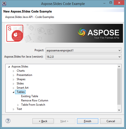 - By using this wizard plugin lets you copy the downloaded Code Examples into your project for using Aspose.Slides for Java from New File -> Java -> Aspose.Slides Code Example