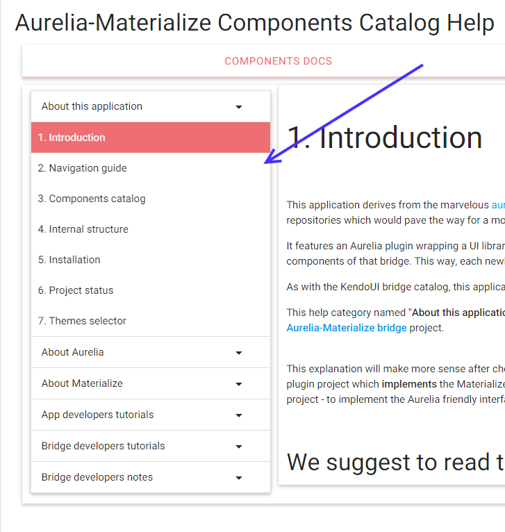 This section which starts with introduction is the collection of articles explaining the purpose and structure of this Aurelia Materialize Components Catalog application. The gist of this collection of articles is: