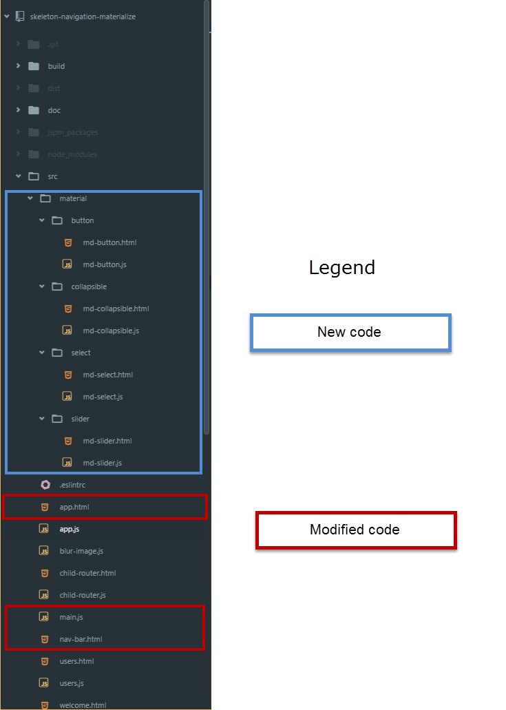 In order to clearly separate the added code from the original Aurelia Navigation Skeleton, the original project structure is changed to this: