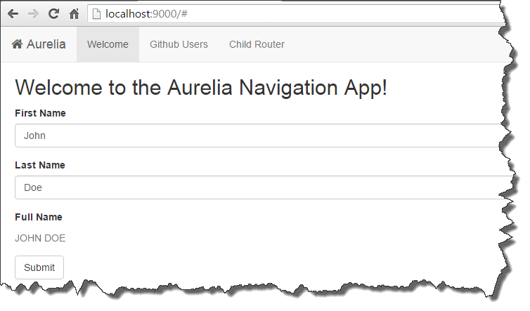 Get it from here and use the Download ZIP method so we do not have to deal with Git issues in this simple context. After downloading this application, extract the contents of the folder named skeleton-es2016 into the folder conveniently named skeleton-navigation-materialize and use the instructions to build and run this app. Specifically, assuming that you already have the NodeJS, jspm and gulp installed, this application should be running after you execute