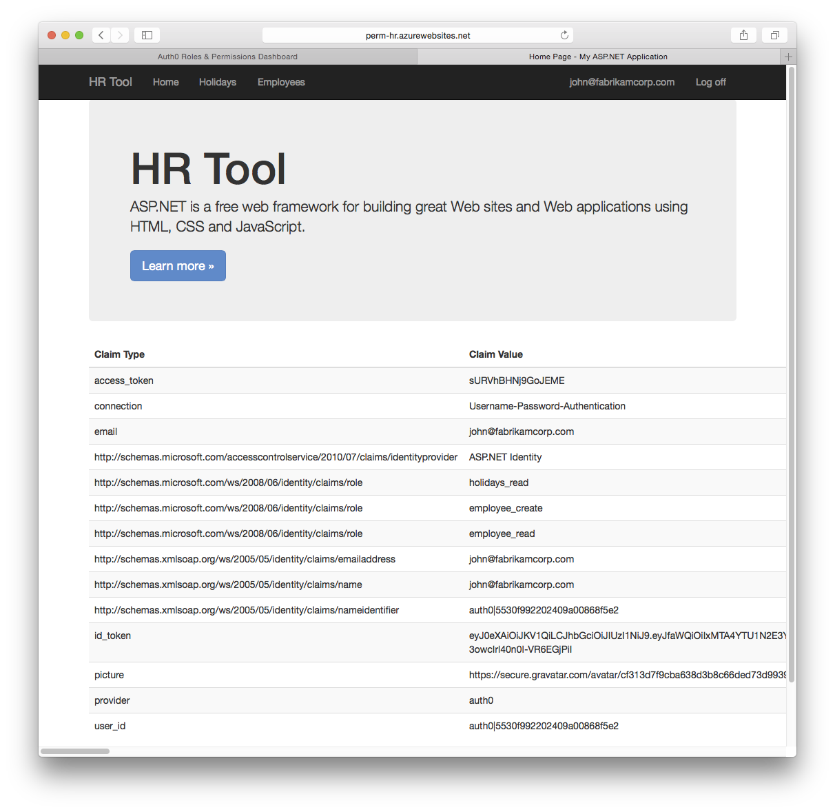 When users authenticate the homepage will show their claims, including the Role Claim which contains all of their permissions:
