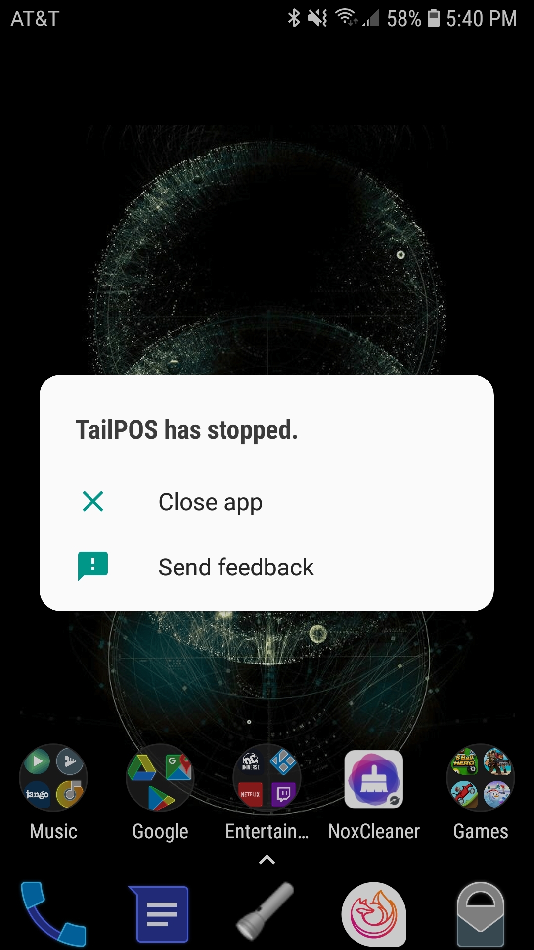 The TailPOS app from the Google Play Store crashes before it can fully initialize.
