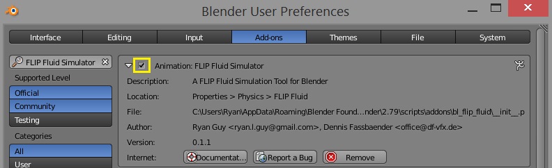 - After installing the addon file, Blender will filter the addons list to only show the OpenFLIP addon. Click the checkbox next to the title to enable the addon