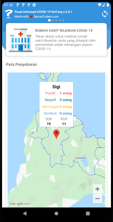 PICO SulTeng (Pusat Informasi COVID-19 Sulawesi Tengah/COVID-19 Information Center of Central Sulawesi) is an android-based application developed to facilitate the people of Central Sulawesi in obtaining information about the current situation of COVID-19 in Central Sulawesi.