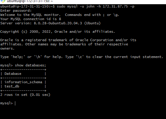 Check that you have successfully connected to a remote MySQL server and can perform SQL queries. You should something similar to the screenshot below: