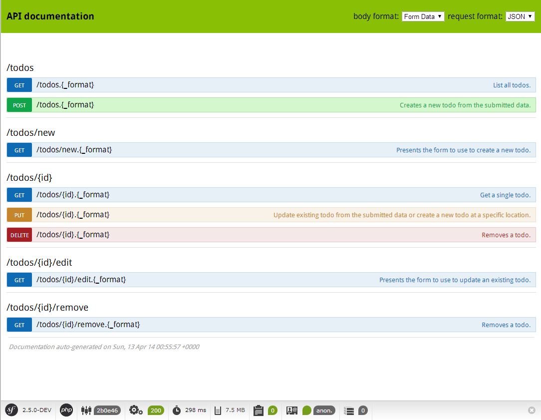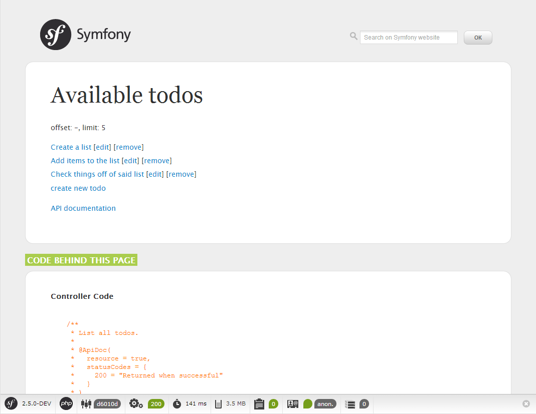 $ php app/console server:run localhost:8080Navigate your browser to the TodoMVC client