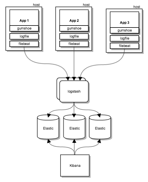 Gumshoe is just the interface by which your application can emit events. To make the data useful, they need to be shipped to a data store where they can be searched, visualized and otherwise explored. Gumshoe was built with an eye towards an ELK stack as the mechanism to ship, index and explore events. Such an infrastructure would look something like this: