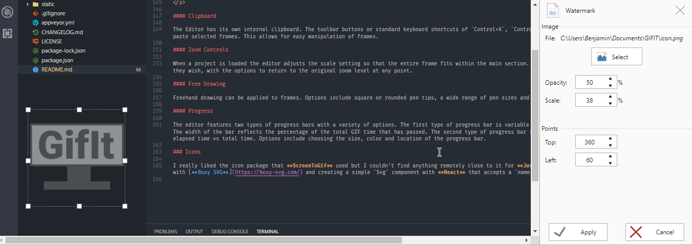 As an alternative, FFmpeg can be used to encode the GIF. This is accomplished by using Node's child_process module. The user must download FFmpeg separately. GitIt will automatically look for the FFmpeg executable in the user's PATH environment variable, but the user can also enter this path manually in options.
