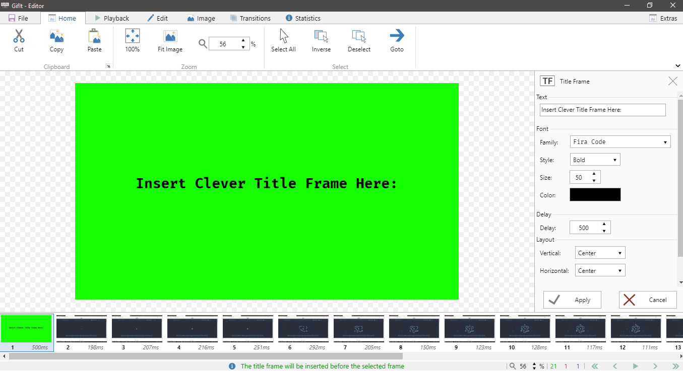 Title frames can be inserted into the frame list at any point and consist of a solid background and text.