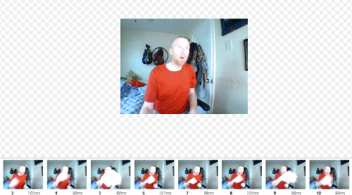 Capture webcam output at a user set size, frame-by-frame at a user set frame rate. This works very similarly to the Screen Recorder except it uses a video input device, aka webcam, of the user's choosing. A notable feature is the ability to scale the size of the video with a HTML range input.