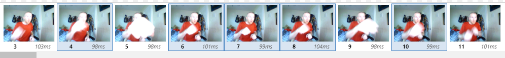 Each frame has a duration property which is set as the frame is captured, based on the initial frame rate. The editor allows setting this property to any value, increasing/decreasing by a set value or scaling up/down by a set percentage. The duration of each frame is displayed with its thumbnail.