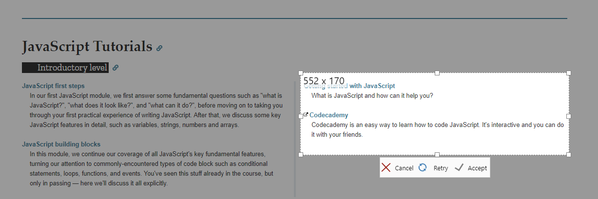 The react-rnd package provides a useful resizable/draggable component that can be used to select a portion of the screen. The dark tinted background is created with 4 separate div elements that resize along with the box.