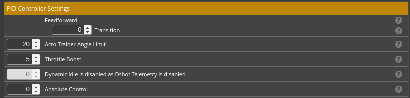 | "message": "With this parameter, the Feedforward term can be reduced near the center of the sticks, which results in smoother end of flips and rolls.<br>The value represents a point of stick deflection: 0 - stick centered, 1 - full deflection. When the stick is above that point, Feedforward is kept constant at its configured value. When the stick is positioned below that point, Feedforward is reduced proportionally, reaching 0 at the stick center position.<br>Value of 1 gives maximum smoothing effect, while value of 0 keeps the Feedforward fixed at its configured value over the whole stick range." |