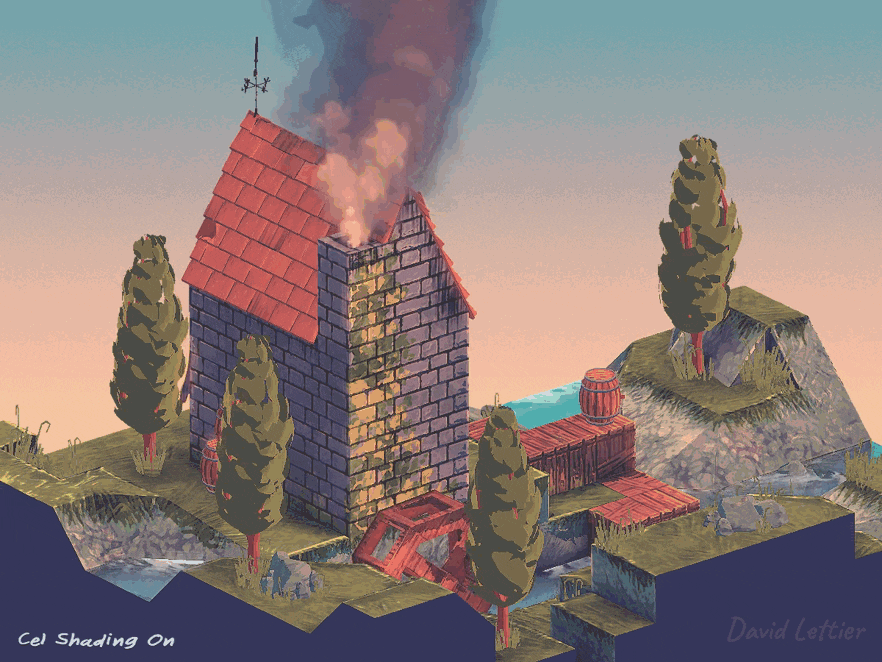 Cel shading is a technique to make 3D objects look 2D or flat. In 2D, you can make an object look 3D by applying a smooth gradient. However, with cel shading, you're breaking up the gradients into abrupt transitions. Typically there is only one transition where the shading goes from fully lit to fully shadowed. When combined with outlining, cel shading can really sell the 2D cartoon look.