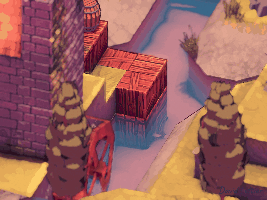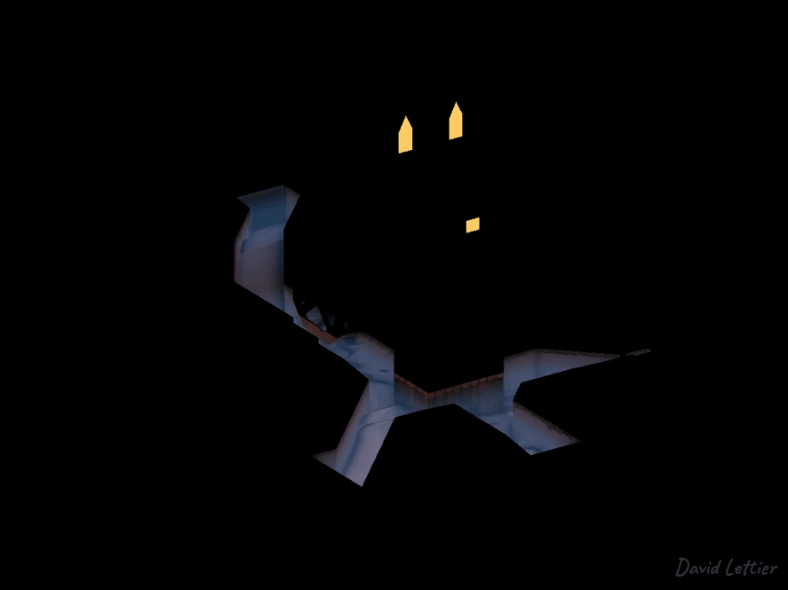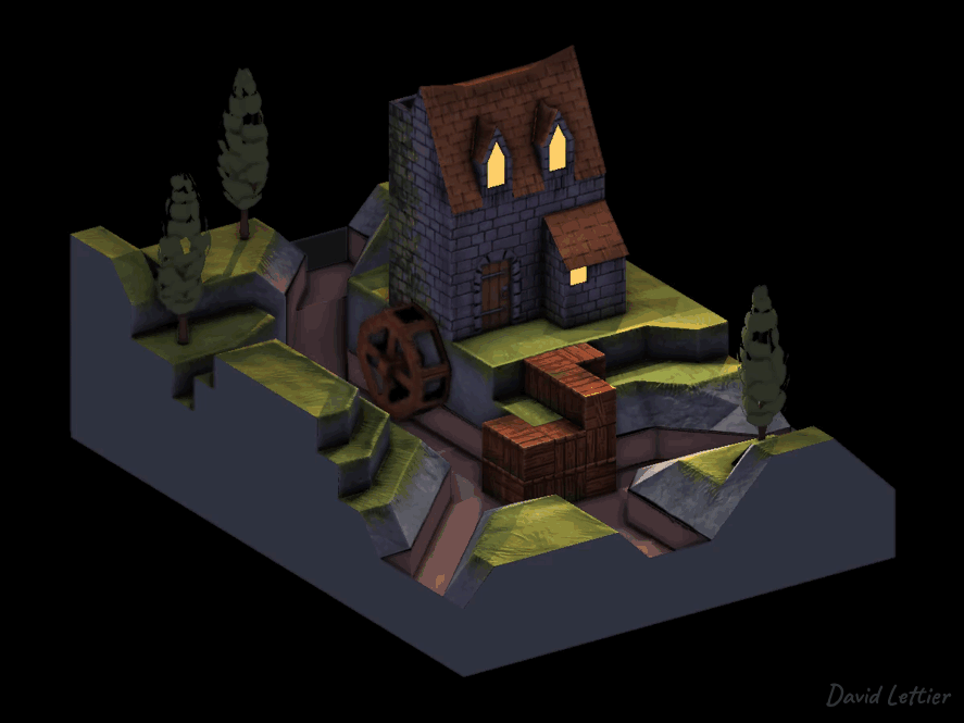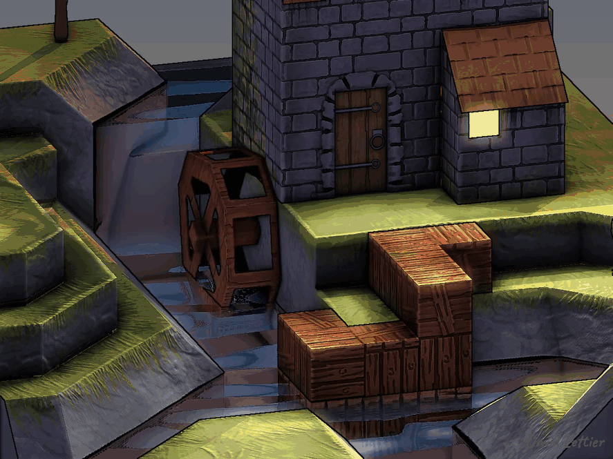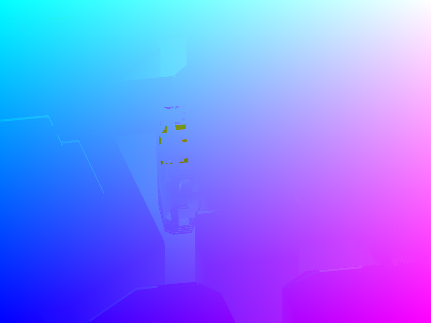 Here you see the refracted UV texture for the mill scene. The wheel and waterway disturb what is otherwise a smooth gradient. The disruptions shift the UV coordinates from their screen position to their refracted screen position.