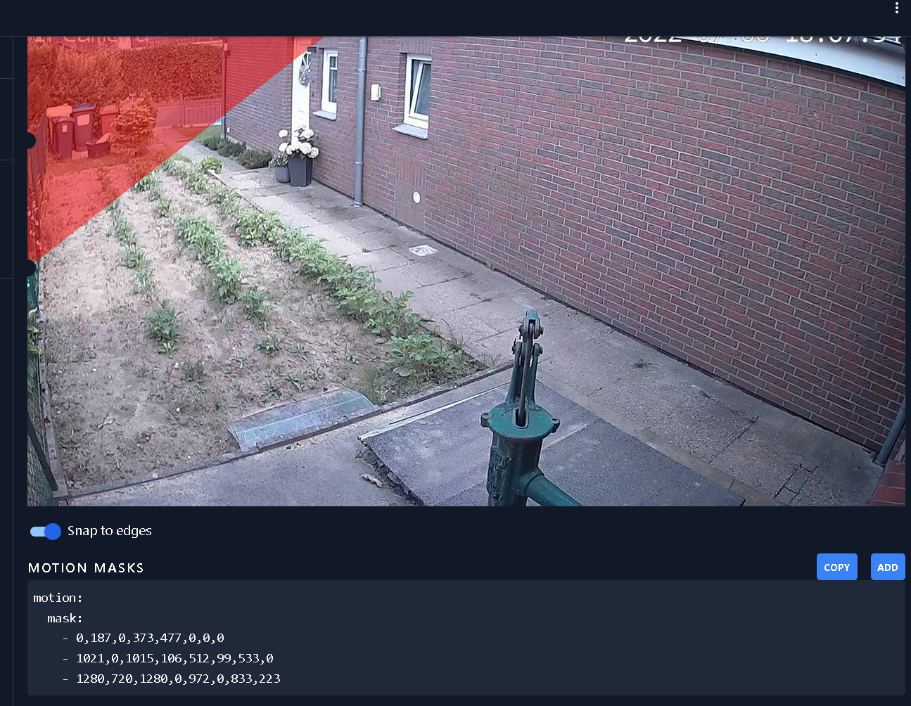 Hi! I noticed that the motion.mask config entry is not camera specific. So the mask of my first camera is automatically applied to my now new second camera. But that's not what I want. The new camera will have a totally different motion mask. What's the why to define different masks for different cameras? Couldn't find an example in the docs, neither in the masks nor the camera section. https://docs.frigate.video/configuration/masks Thanks in advance for any help! |