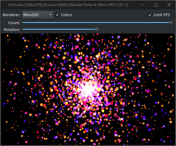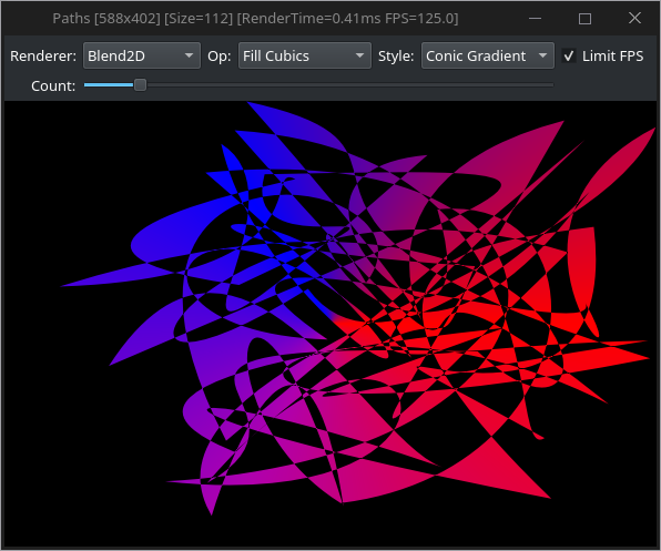 bl_bench- Blend2D bencharking tool that can be built either standalone or with support for AntiGrain, Cairo, and Qt libraries, for comparison.bl_demos- Blend2D interactive demos that use Blend2D and Qt toolkit for UI and quality/performance comparison