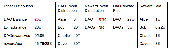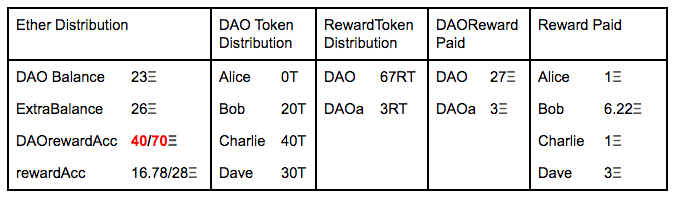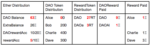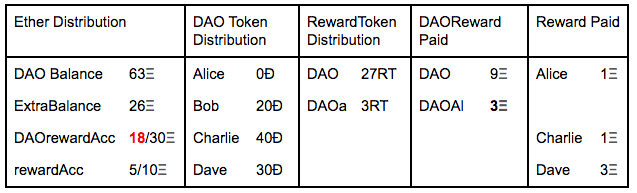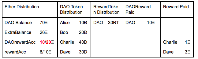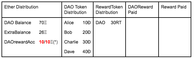 When the DAO approves to pay rewards to their tokenHolders via a proposal, what it does is transfer the total amount of Ethers that wants to pay to the rewardAccount.