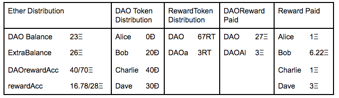 For example if Alice owns 10% of the DAO Tokens and 150Ξ are Invested in a proposal, the DAO will generate 150 * 10^18 RT of which 15 * 10 ^ 18 belongs to Alice.