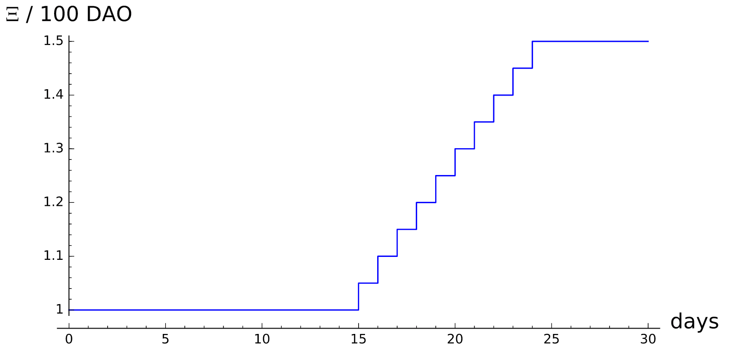 During the Creation phase, the price of the DAO Token is not static. At the beginning of the process, 100Ð cost 1Ξ. But at the end of the process 100Ð costs 1.5Ξ.