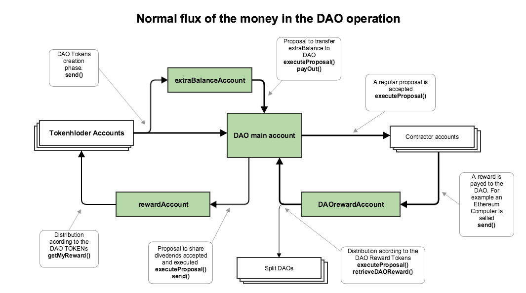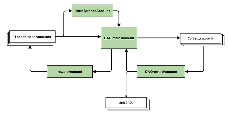When there is some Ether in this account, the DAO will need to approve a proposal to take all the Ether that belongs to it and transfer it to the main DAO account. It can also opt to transfer the Ether directly to the rewards account so that it can be claimed by the DAO Token holders.