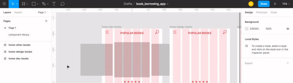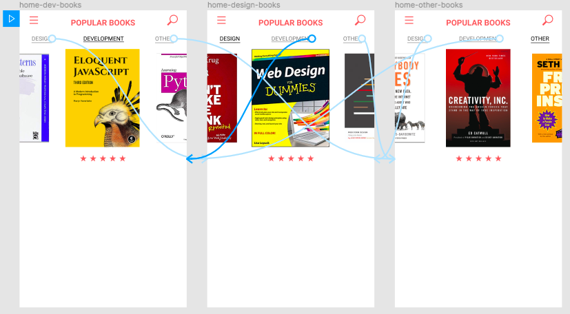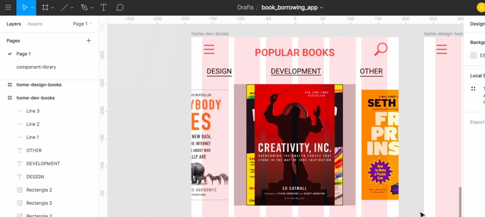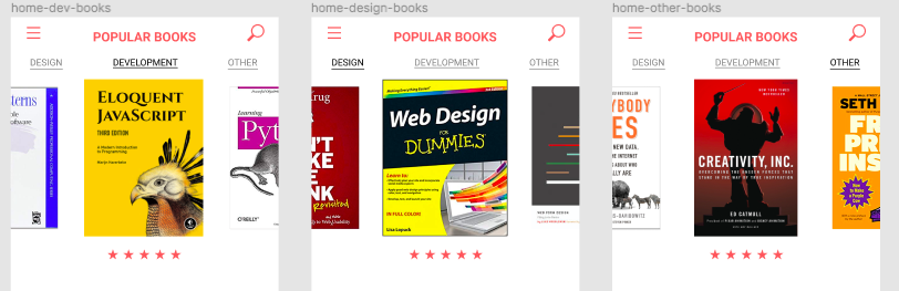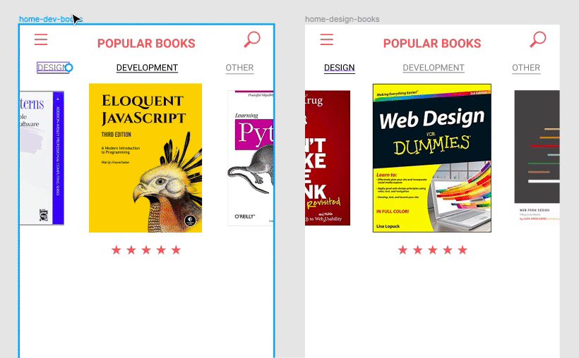 - When we copy this component into our other frames, we can show/hide the different images to show books from the different categories. We can also apply opacity to the inactive book category names.