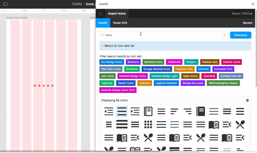 - Bring up the Iconify menu and search for a menu icon in the search field. Drag and drop your favourite icon into a frame