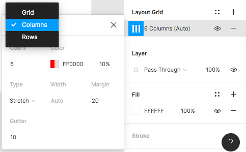 - Making sure that our first frame is selected (click on the frame name to select it), click the 'Layout Grid' submenu in the Properties Panel to add a layout grid to the frame. To display columns, we need to click on the grid icon, then click on 'Grid' in the pop up menu, and select 'Columns' from the dropdown. Change the 'Count' to 6, the 'Margin' to 20, and the 'Gutter' to 10:
