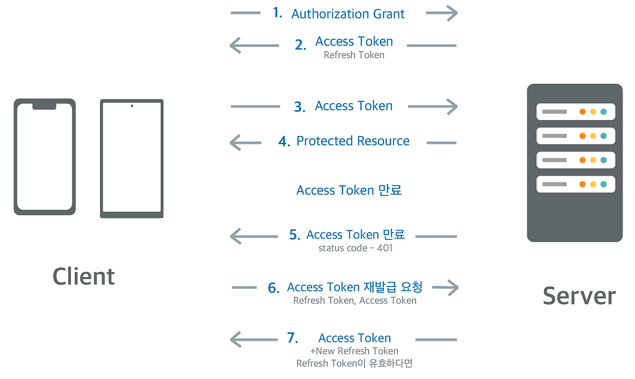 - Client가 refresh token과 만료된 access token을 가지고 재발급 요청을 보내면