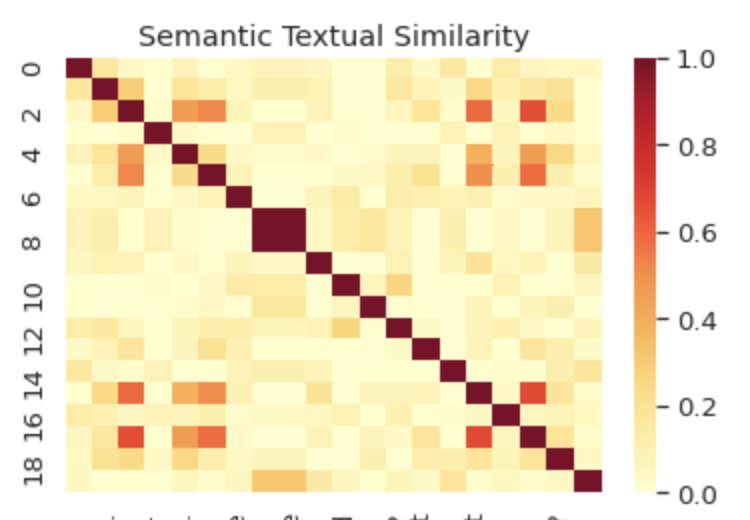 We ran 20 such comments through the Univeral Sentence Encoder as well as SBERT. We plotted the results in a confusion matrix below to visualise the similarity of the sentence vectors. The darker the colours, the more similar the models deemed the two sentences.